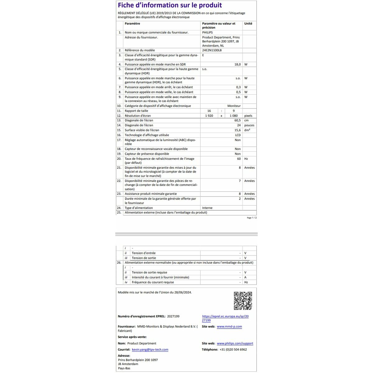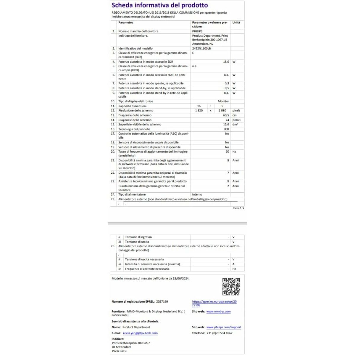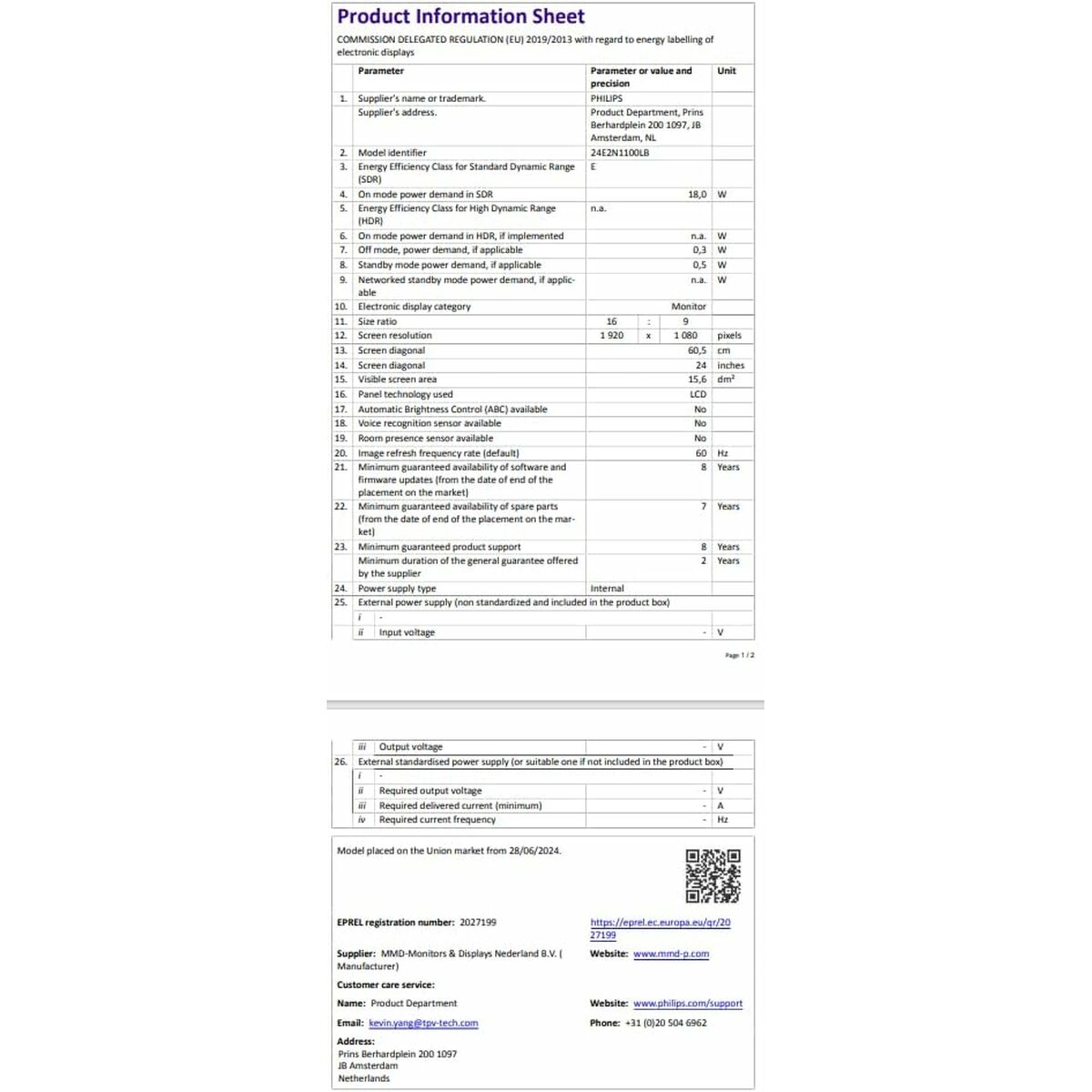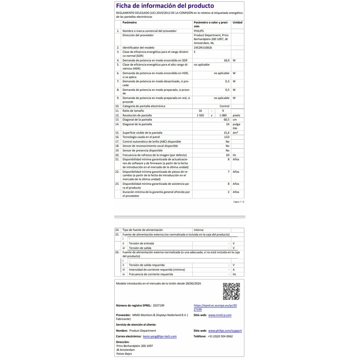 The Philips 24E2N1100LB/00 monitor is a display device designed to deliver a high-quality visual experience thanks to its LED technology, which provides sharp images and balanced colors with efficient energy consumption. This model features key attributes for both professional and home environments, such as adjustable height, allowing the screen to be positioned for optimal posture to reduce eye strain and improve ergonomics during long working hours. Additionally, it includes an LED screen with support for HDR (High Dynamic Range), offering a significant enhancement in color range and contrast, enabling more realistic and detailed content reproduction in both shadows and highlights. Its design also allows for wall mounting, providing flexibility for customized setups and space optimization in workstations or studios. As a monitor, it targets users needing a versatile and up-to-date solution that combines high visual quality with adjustable features, ensuring comfort and faithful image reproduction for tasks requiring visual precision or quality multimedia consumption. These combined features position the Philips 24E2N1100LB/00 as a balanced mid-range device, ideal for professionals and users who value ergonomics, versatility, and an improved visual experience in an efficient monitor.