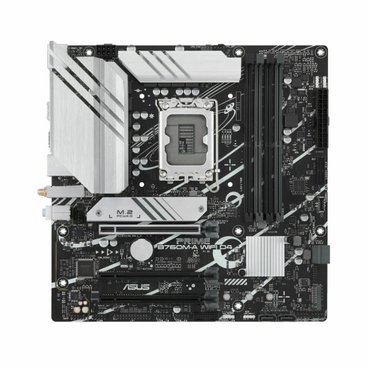 The PRIME B760M-A WIFI D4 from Asus is a motherboard designed to offer an optimal balance between performance and connectivity in systems based on Intel processors with LGA 1700 socket. This board features the Intel B760 chipset, providing support for the latest Intel architectures, ensuring stable and efficient operation for setups focused on productivity, multimedia, and moderate gaming. Its MicroATX (mATX) form factor allows compatibility with compact cases without sacrificing expansion options, ideal for space-saving configurations. It supports DDR4-SDRAM memory, enabling the use of more affordable RAM modules with a good balance of speed and power consumption, while ensuring compatibility with operating systems like Windows 10. Regarding connectivity, it stands out for integrating Wi-Fi and Bluetooth, facilitating wireless connections for both networks and peripherals, adding versatility when building a PC without extra devices. It also includes USB 2.0 ports to connect numerous traditional peripherals. The high-quality plastic construction contributes to a solid yet lightweight structure. This motherboard is a versatile mid-range option from Asus, aimed at users seeking compatibility with current components and built-in wireless connectivity for compact, functional desktop PCs.