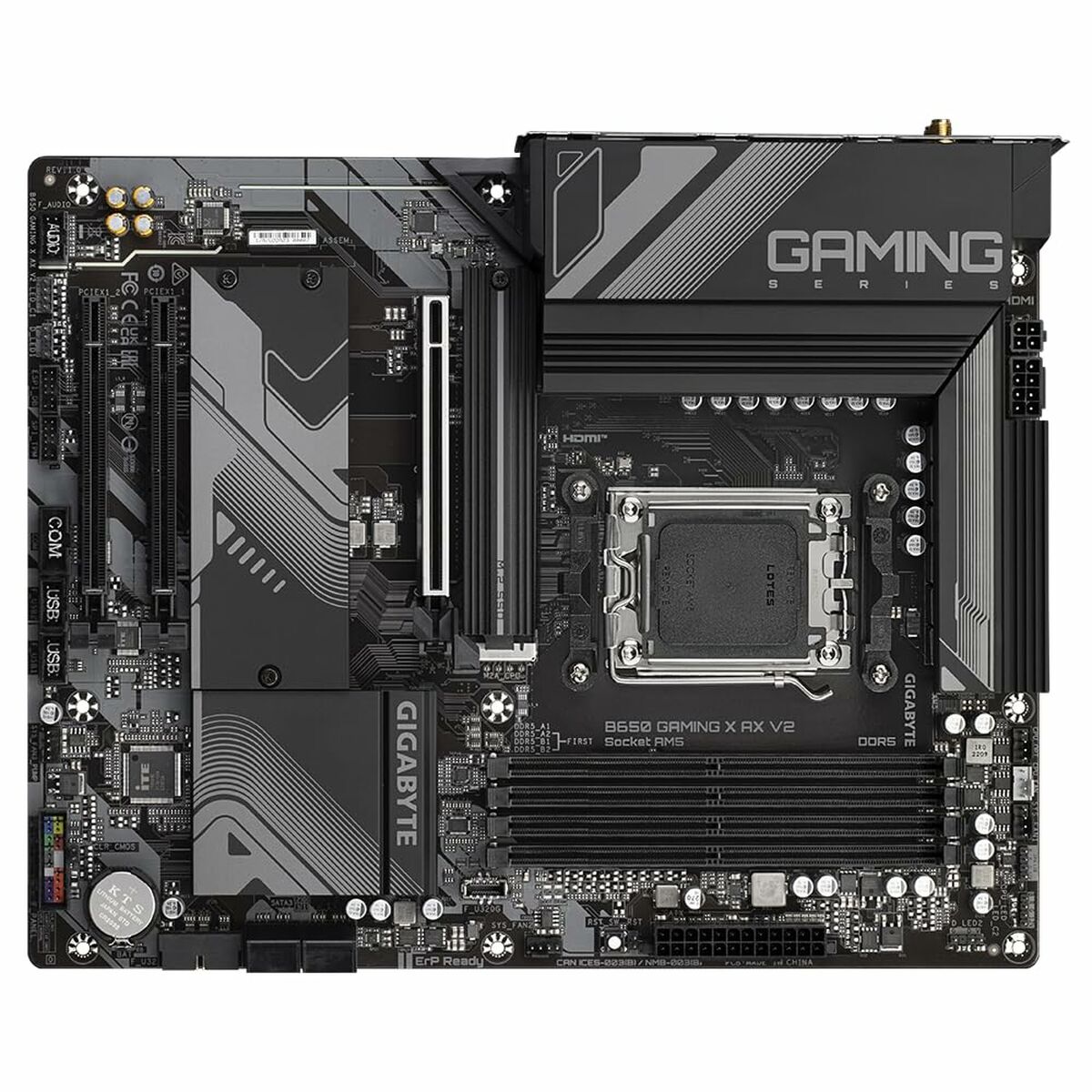 The Gigabyte B650 GAMING X AX V2 is a motherboard designed for advanced users and hardware enthusiasts seeking support for the latest generation of AMD processors. This board features the AMD B650 chipset and is compatible with the AMD AM5 socket, offering support for AMD Ryzen™ processors from 5th to 7th generation, ensuring excellent upgrade potential and performance for demanding applications and gaming. Its ATX form factor provides a balanced space and compatibility with a wide range of cases and cooling systems. It includes four slots for DDR5 RAM, supporting up to 192 GB of DIMM memory, allowing maximum capacity and system responsiveness. For storage, it supports multiple technologies including 6 SATA III ports for traditional hard drives and SSDs, plus two M.2 PCI Express 4.0 connectors for high-performance NVMe SSDs that speed up access and data transfer times. Connectivity options are enhanced with an advanced network system that includes 2.5 GbE Ethernet for fast wired connections, as well as Wi-Fi 6E and Bluetooth 5.3 for stable and fast wireless links. The board also features multiple USB 3.2 ports, both Type A and Type C, offering great versatility for modern external devices and peripherals. For video output, it includes HDMI and DisplayPort interfaces, supporting resolutions up to 4096 x 2160 pixels, suitable for 4K monitor setups. Its design combines black and brown colors within a sober aesthetic that fits gaming or professional environments. Additionally, it supports RAID 0, 1, and 10 configurations, enhancing the security and performance of connected storage drives. Overall, the Gigabyte B650 GAMING X AX V2 provides a solid and advanced foundation to build powerful and versatile systems aimed at intensive use requiring compatibility with the latest technologies and ample upgrade potential. This motherboard stands out by combining performance, connectivity, and support for the latest memory and storage technologies, making it a reliable and up-to-date choice for demanding users.