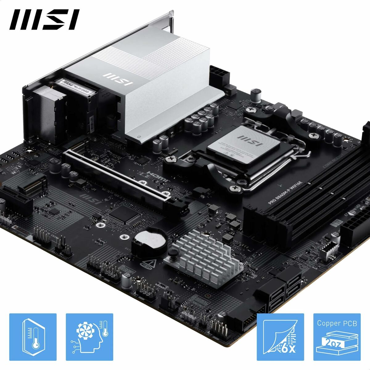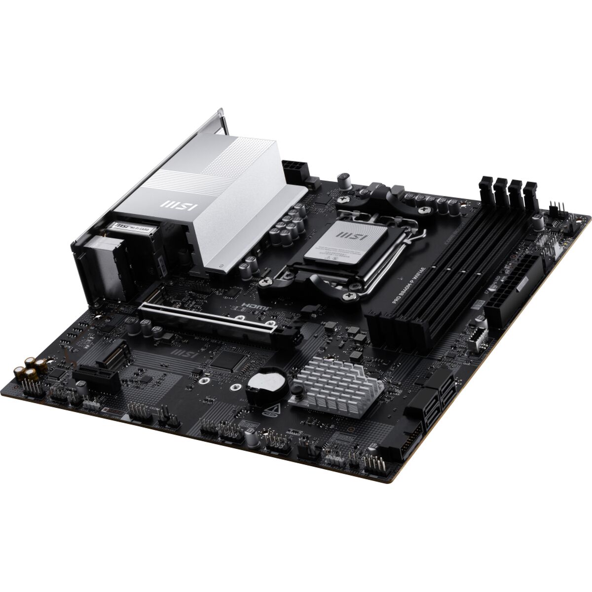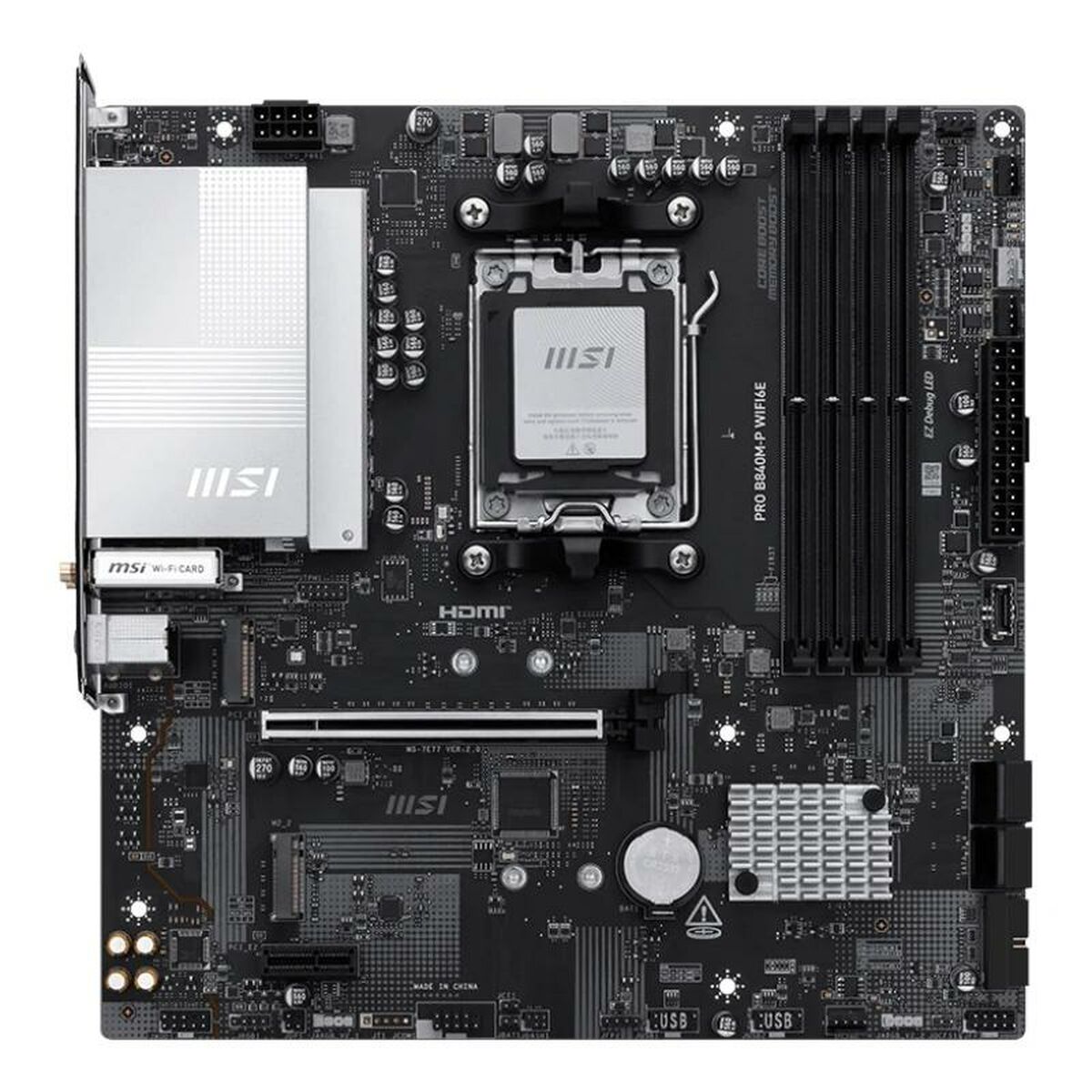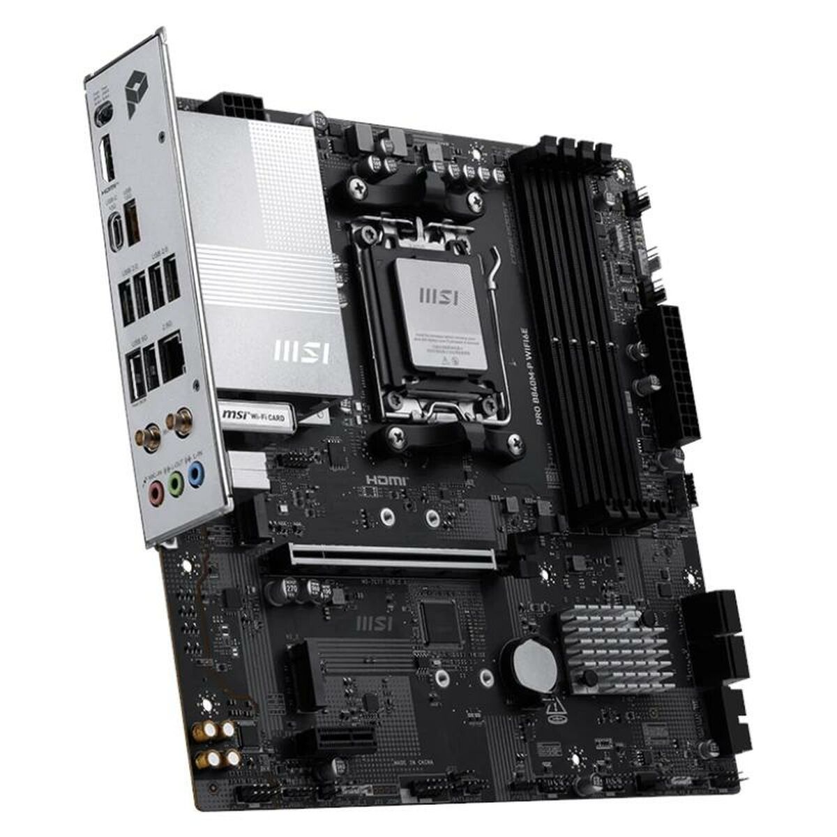 The MSI PRO B840M-P WIFI6E is a motherboard designed for high-performance systems, equipped with the latest AMD AM5 chipset, compatible with new-generation AMD processors that ensure optimal processing power for demanding tasks and advanced setups. Its AMD AM5 socket offers broad compatibility with the latest CPUs, enabling long-term upgrades and improvements. This motherboard features a MicroATX form factor, combining a compact size with a sturdy design, ideal for cases requiring space efficiency without sacrificing performance. It stands out by offering advanced wireless connectivity thanks to its built-in Wi-Fi 6E support, providing higher speeds and lower latency on compatible networks, as well as Bluetooth functionality for easy peripheral connections. Among its physical ports, it includes an HDMI port that enables high-definition video output, suitable for monitors or external displays without extra hardware. Its black design ensures a sleek, professional finish, compatible with common PC operating systems such as Windows. This motherboard is a versatile and balanced solution, aimed at users seeking a stable, modern platform that combines technological innovation with MSI’s reliability. Overall, the PRO B840M-P WIFI6E is a solid, up-to-date choice for building or upgrading desktop computers focused on advanced connectivity and balanced performance.